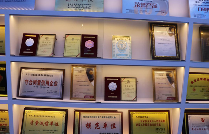 在展厅的长廊内,有一面荣誉墙特别的引人注目,墙上整整齐齐的挂满了玉泉酒业历年来获得的各项荣誉奖项。例如:黑龙江省诚信示范企业、省市级守合同重信用企业、消费者最喜爱的黑龙江100种绿色食品荣誉产品、国家二级企业证书、国家级放心酒工程•示范企业等。